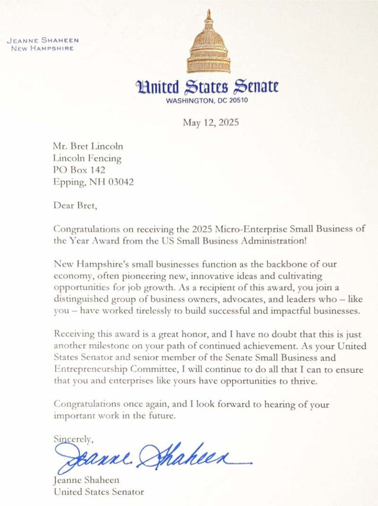 “We are proud to recognize Bret Lincoln, owner of Lincoln Fencing, for his dedication and commitment to starting and growing a successful small business during a turbulent time, the COVID pandemic,” said Amy Bassett, NH SBA district director. “Small businesses are the pillars of our community, particularly the micro-businesses which create wealth and job opportunities for the owner and their employees. Small business owners are dedicated community members, and Bret’s company is no exception, generously supporting community projects to benefit those in need.”